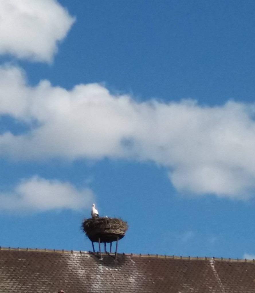 En regardant vers le haut du toit d’une maison alsacienne, vous voyez ce que j’ai vu dans le nid de la cigogne? On dirait une petite tête blanche! Bébé cigogneau est en avance!En fait ça ne m’étonne pas puisque maman et papa sont arrivés début février!