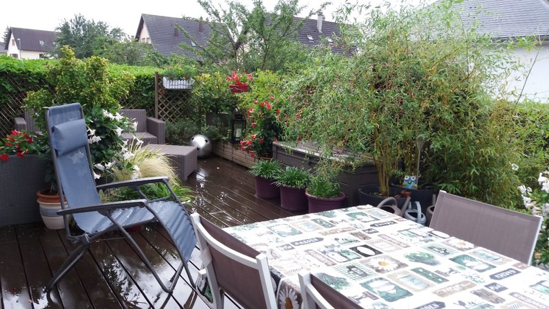 Il ne me restait donc plus qu’à faire une photo de ma terrasse sous la pluie hier matin ! Une pluie bénéfique et une baisse de la température extérieure bénéfique elle aussi!!
