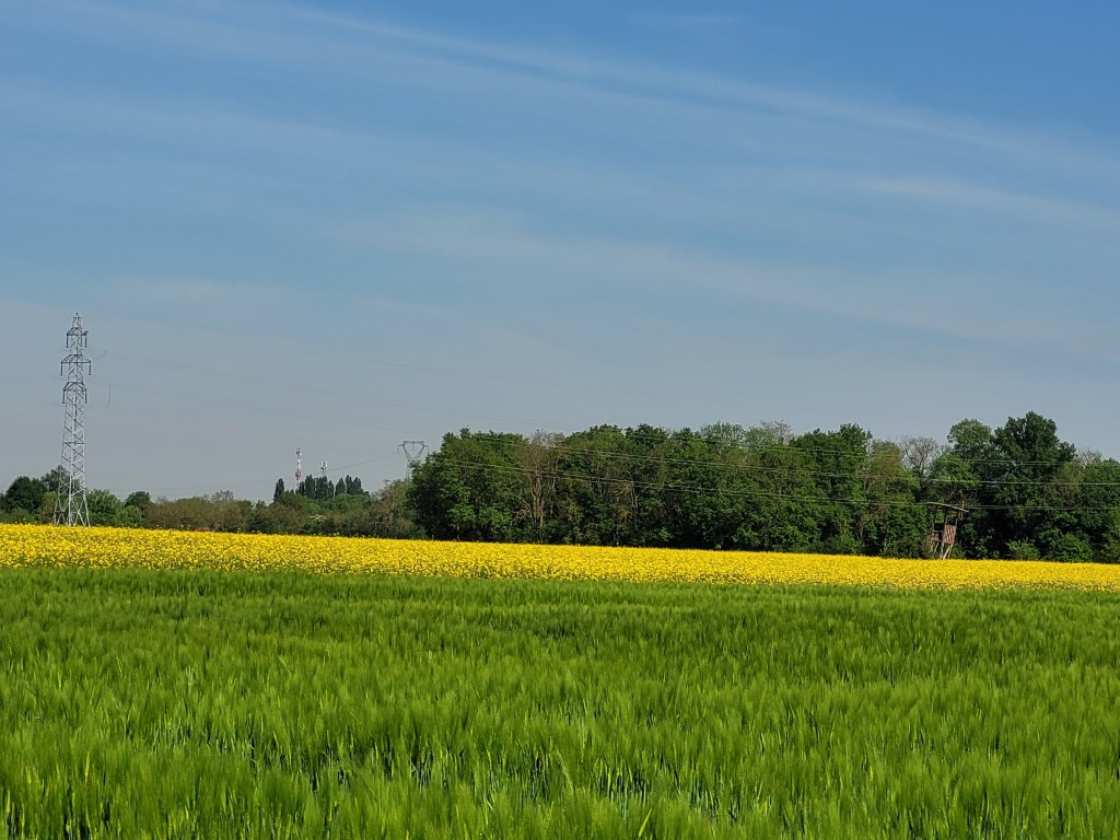 J’ai fait il y a quelques jours une photo dans les champs! Les couleurs sont magnifiques! Le vert de l’orge prend une couleur argentée en ondulant au vent, et le jaune du colza qui fleuri partout, fait un joli contraste parmi toutes ces nuances de vert.