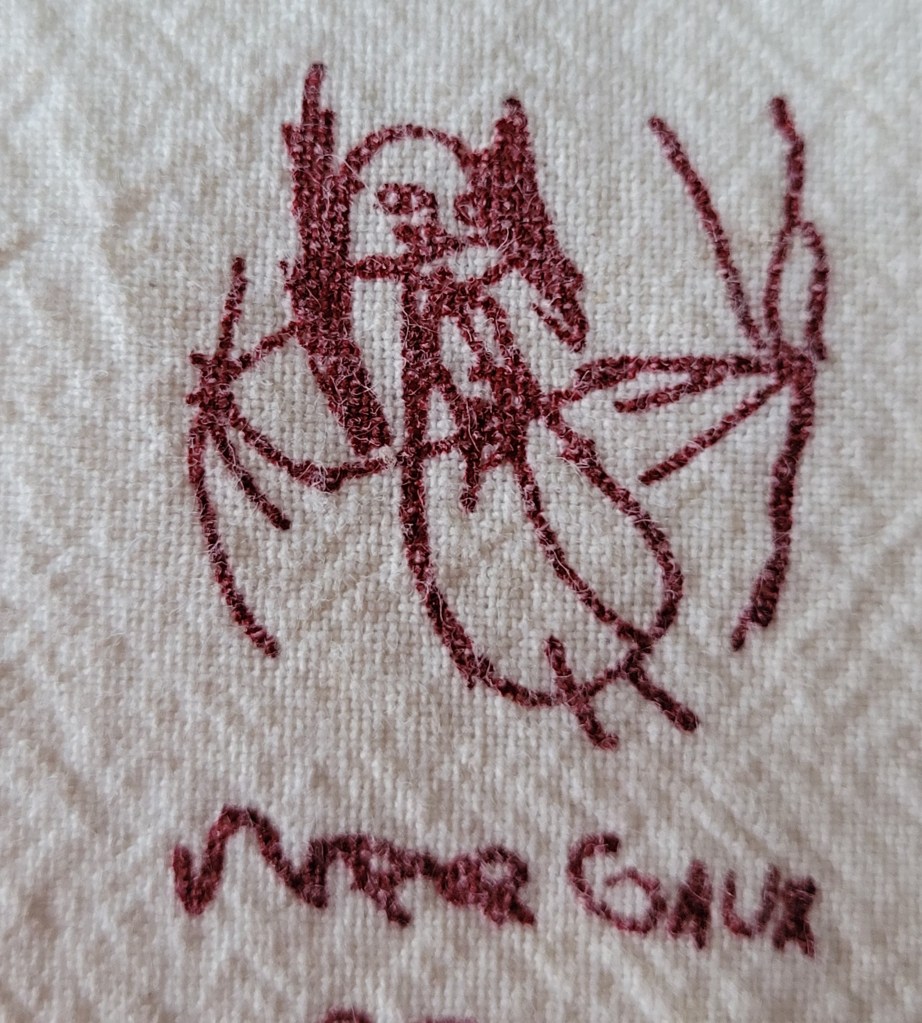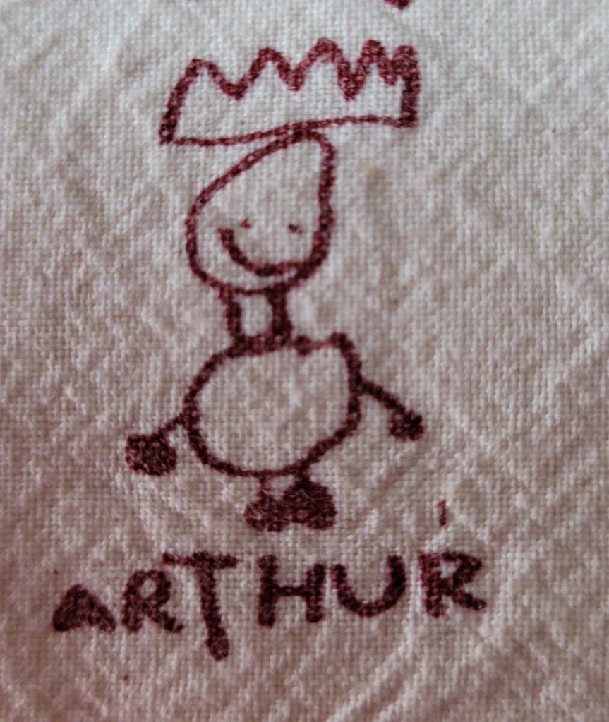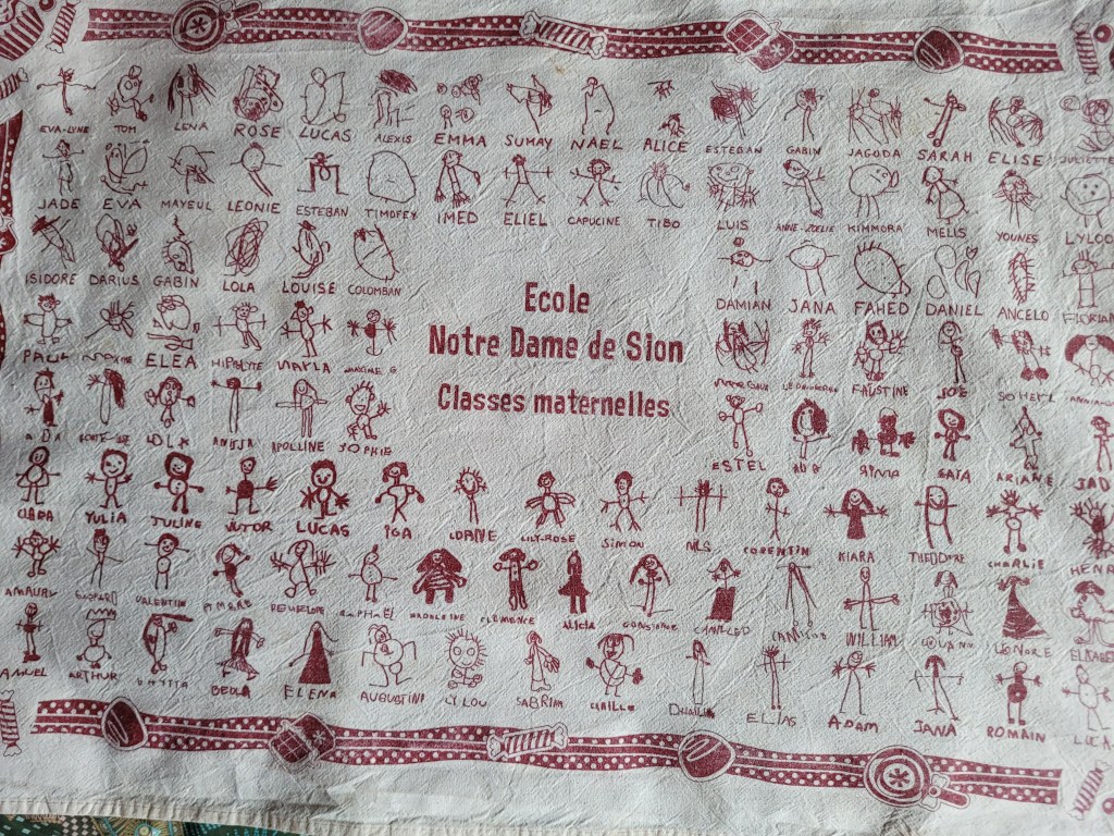 J’ai ,par hasard, retrouvé un souvenir de ma petite fille Ada lorsqu’elle était à l’école maternelle. Un adorable rectangle de tissu, où les enfants avaient écrit leur nom( pour les tout petits je pense que c’est la maitresse qui a aidé) illustré par un dessin.