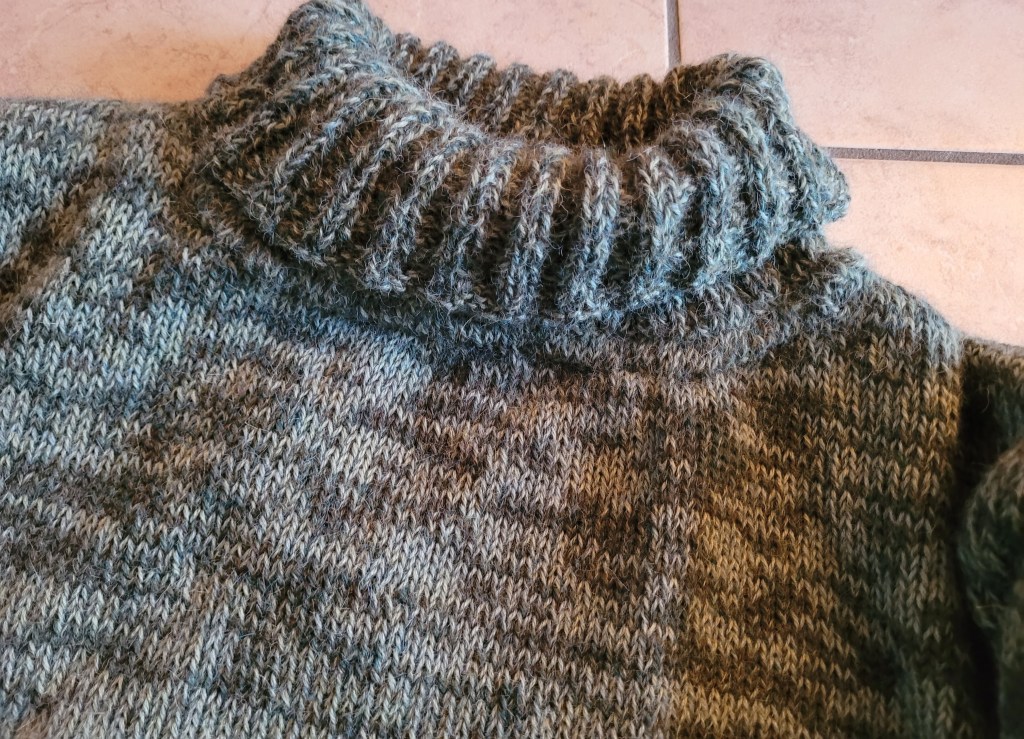 La finition du col a été un peu laborieuse, je n’ai pas pu monter l’encolure sur la machine à tricoter, il y avait trop d’épaisseur, je l’ai donc terminée à la main.