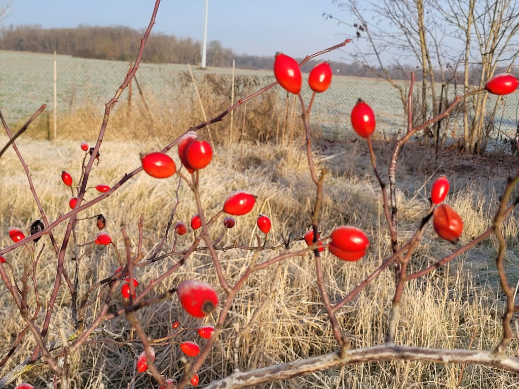 Le 3 janvier 2021 les cynorhodons étaient emprisonnés dans le givre, le 3 janvier 2025 ils rayonnent sous un doux soleil!