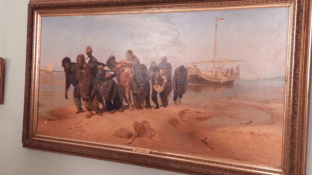 C’est la première peinture d’Ilia Répine (1844-1930) à avoir eu un grand succès. L’idée de ce tableau lui était venue lorsqu’il étudiait encore à l’Académie des arts, à Saint Pétersbourg. En se baladant sur les quais de la Neva, il avait été frappé par l’allure des bateliers qui tiraient, à bout de forces, des fardeaux à côté de citoyens se promenant insouciants.