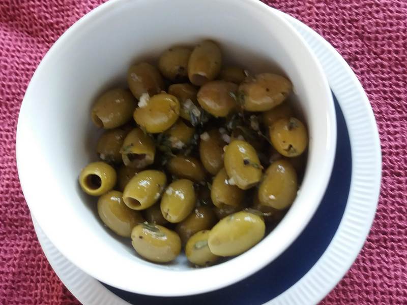Alors cette fois j’ai acheté un bocal d’olives vertes , je les ai égouttées, assaisonnées de vinaigre et d’huile, j’ai ajouté 2 gousses d’ail ,des herbes de Provence je les ai mise au frigo pendant une heure