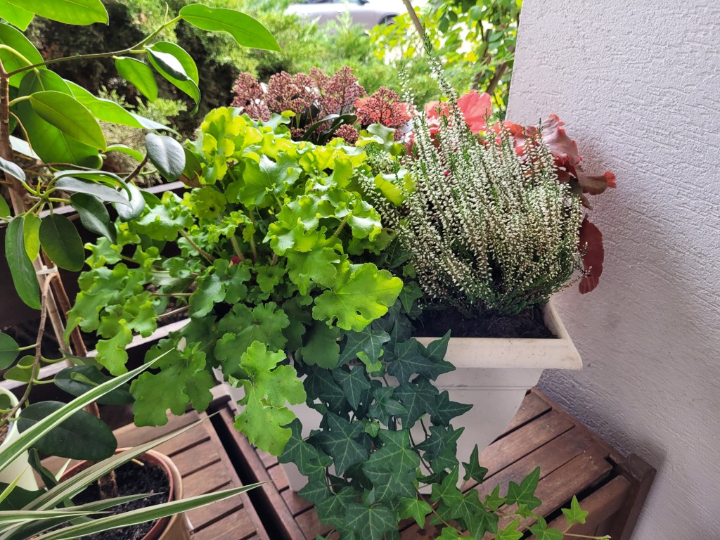 Euchères, couleur verte et caramel une bruyère calluna blanche , un Skimmia et un lierre! Ce sont des plantes qui supportent bien les basses températures! Si,si,le froid va finir par arriver!!