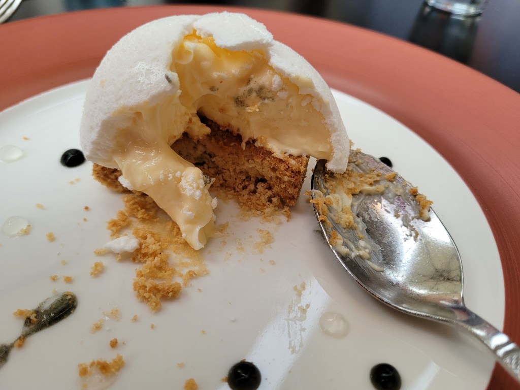 Le dôme c’est une croûte de meringue, à l’intérieur un lemon curd, sur fond de tarte sablée. Tout autour des touches noires de réglisse, les touches transparentes je ne sais plus!