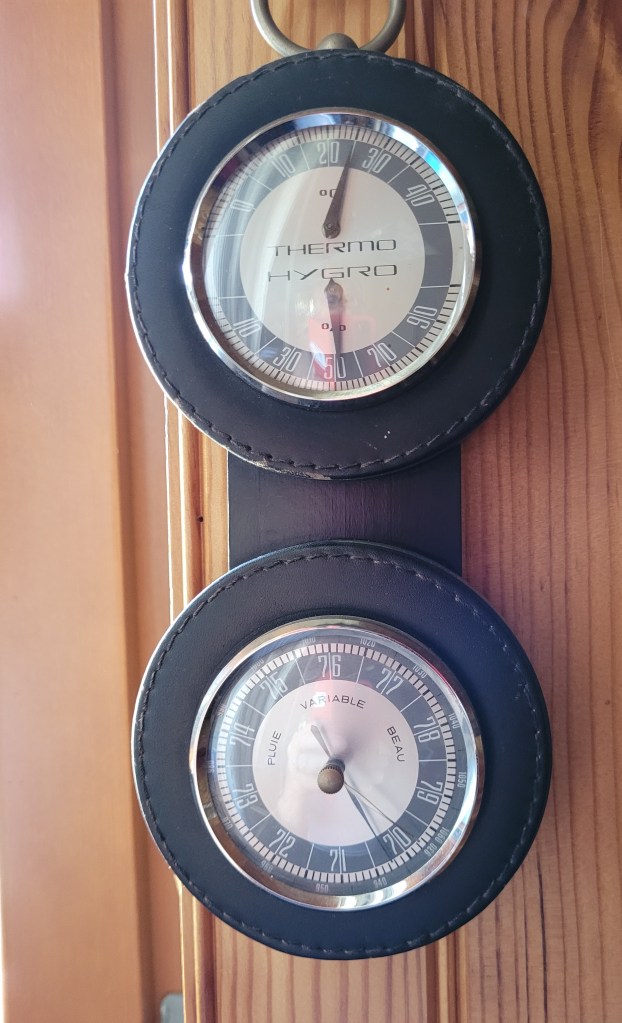 C’est le baromètre que mon papa avait dans son bureau, je n’avais pas le droit d’y toucher,c’est lui qui toquait sur la vitre pour voir de quel côté bougeait l’aiguille noire par rapport à l’aiguille grise, si elle allait vers la gauche il ferait beau, et si elle remontait vers la droite c’était le mauvais temps qui s’annonçait ,et de plus en plus à droite, la pluie!!