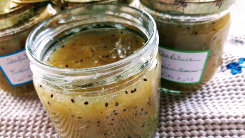 Et pour finir ces encours j’ai vu chez Olgayou une recette de confiture Bananes-Kiwi qui m’a tentée.