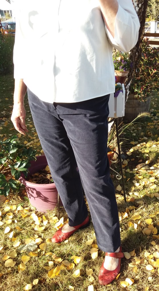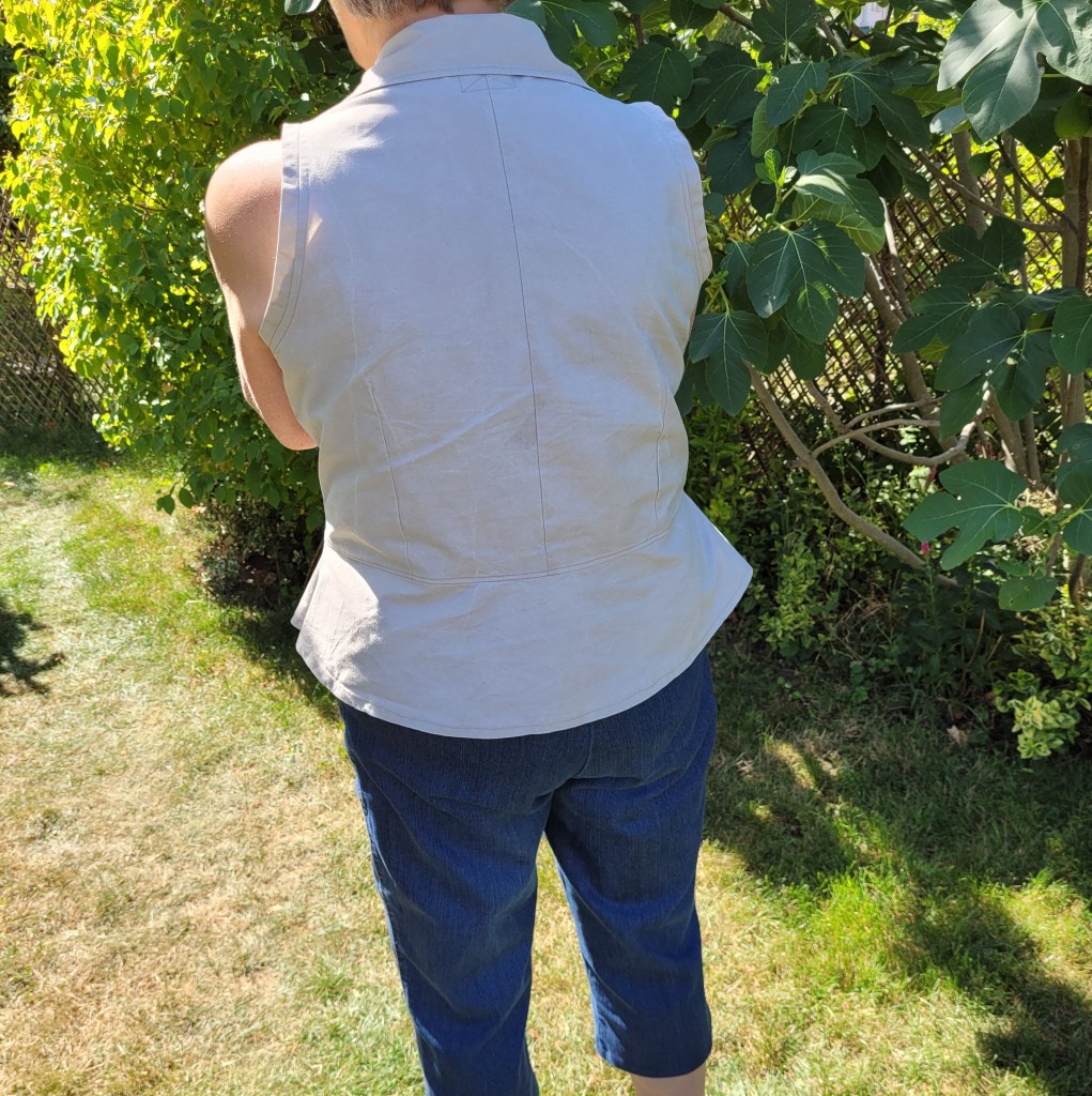 J’aime tellement la porter que j’en ai commencé une autre en tissu plus souple gris clair, bien au frais dans mon atelier alors qu’il faisait 34° dehors!