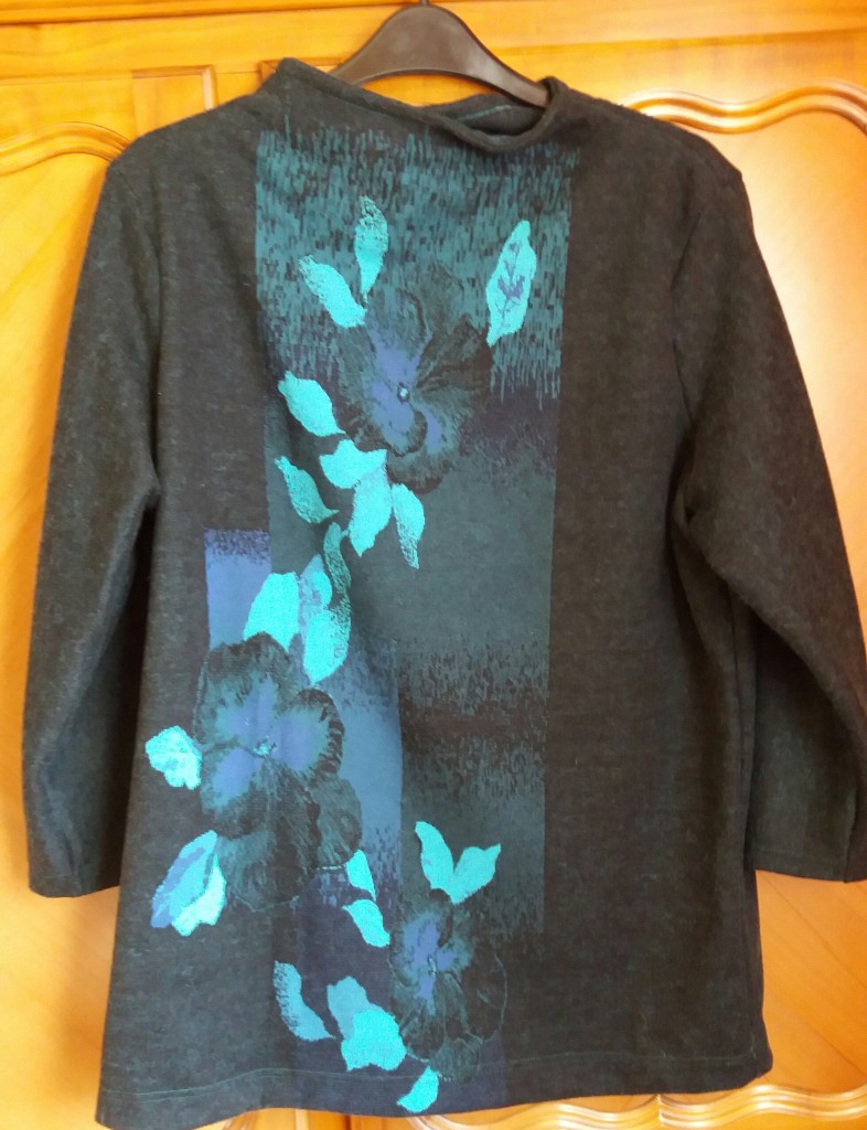 Pour finir j’ai sorti de mon armoire à tissu un lainage pour me faire un pull long, où une robe courte!Moi je ne porte plus de robe mais j’aime bien un long pull avec un legging